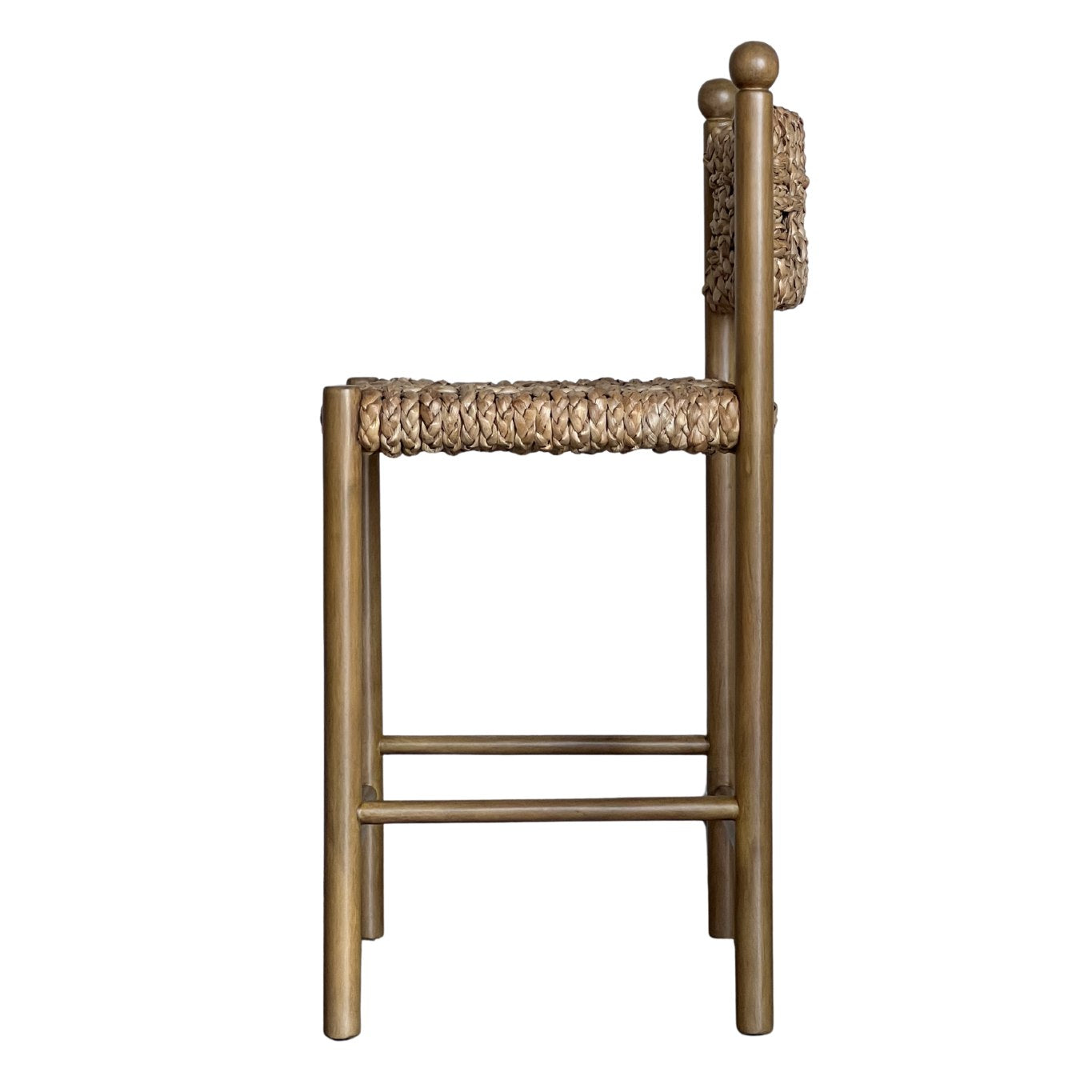 Crafted from light weight Gmelina wood in a natural finish, the frame highlights the warmth and grain of the timber. Clean lines are softened by rounded finial details, giving the stool a subtle sculptural presence without excess.
