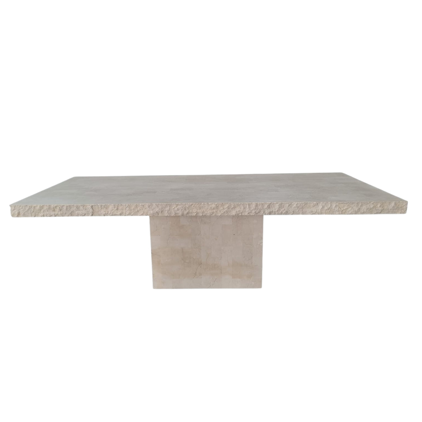 The honed tabletop is framed by a chiseled edge, left intentionally raw to expose the natural character of the stone. This contrast between smooth and fractured surfaces defines the piece, balancing precision with irregularity.