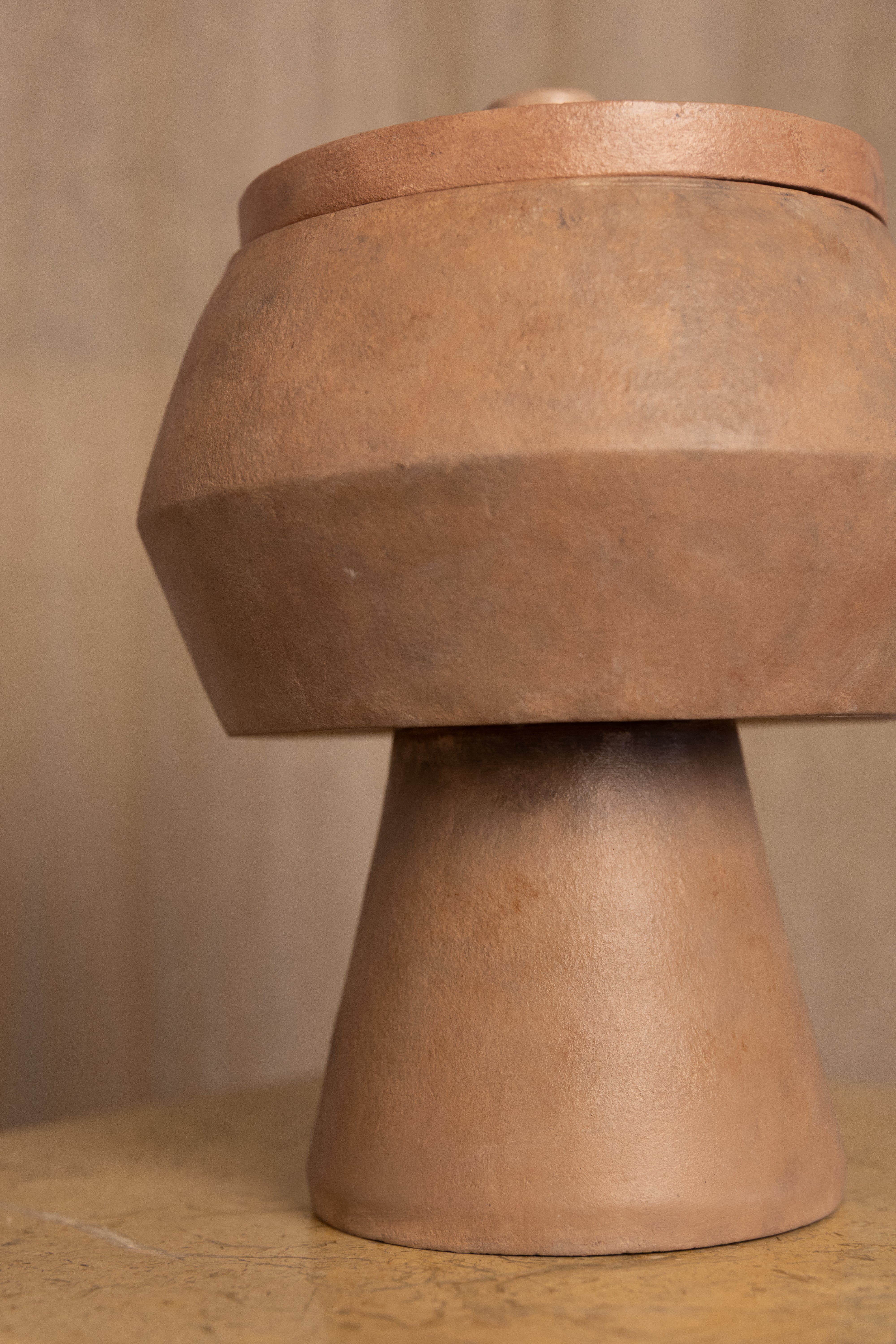 Clay No. 4 has a grounded, ceremonial feel - a hand-built clay form paired with a flat lid and rounded knob. The soft terracotta and smoke tones meet in a natural gradient, with tactile textures that catch light gently. Ideal for open shelving or styled as a small anchor piece in a vignette.