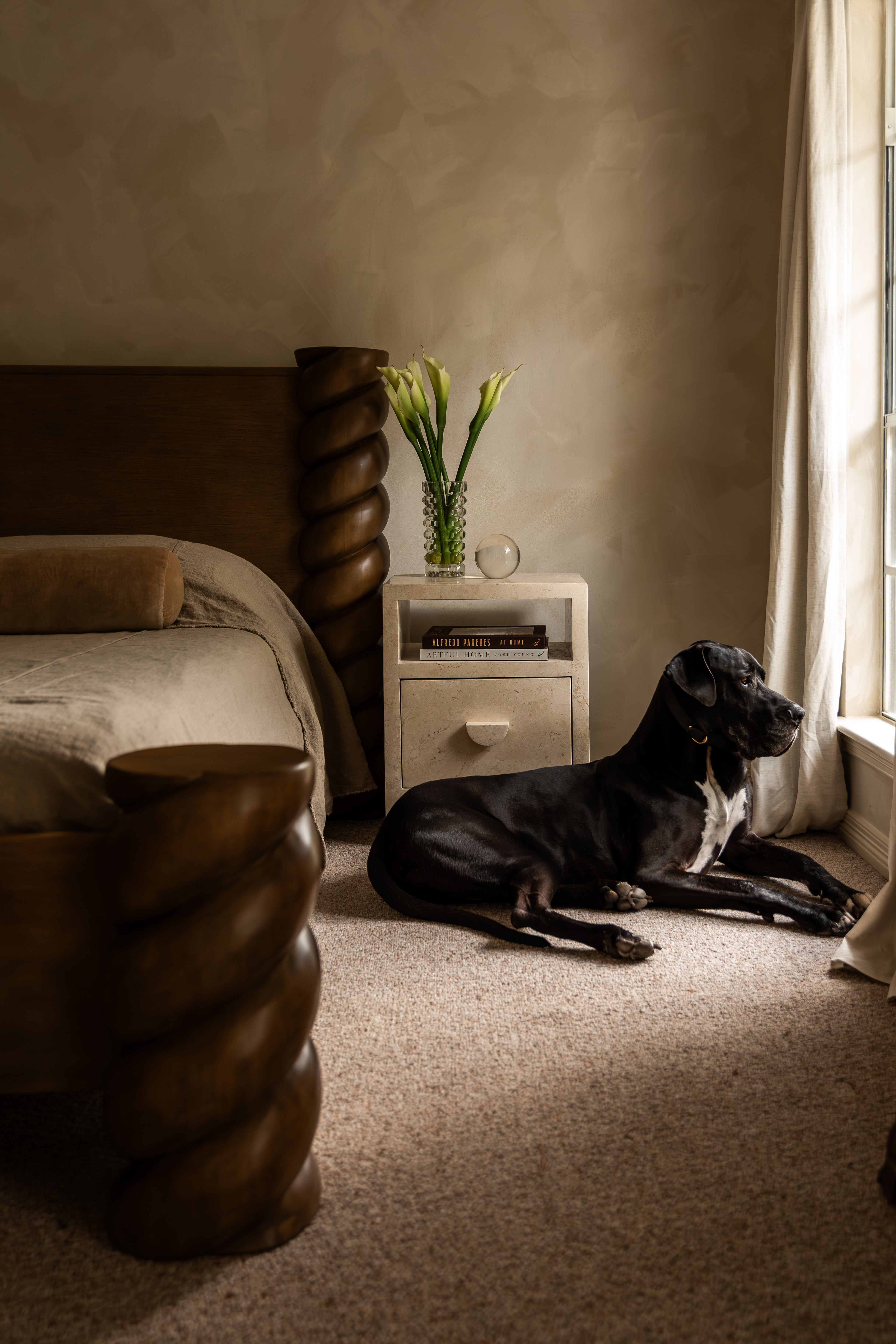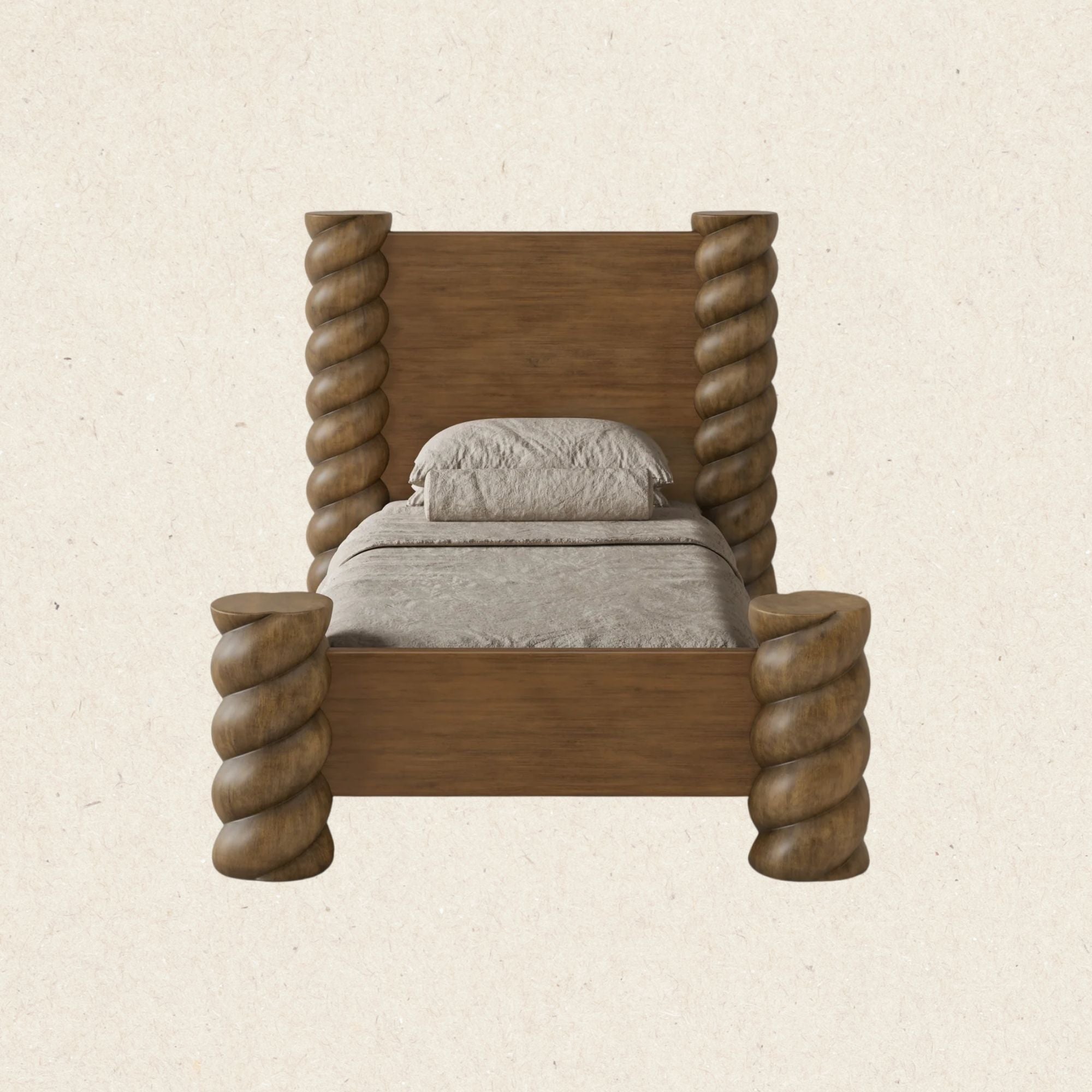 The Myrrh Bed brings sculptural artistry into the bedroom with En Gold’s signature hand-carved wood detailing. Featuring bold twisted pillars that frame a streamlined timber headboard, the design blends strength, craftsmanship, and refined simplicity.