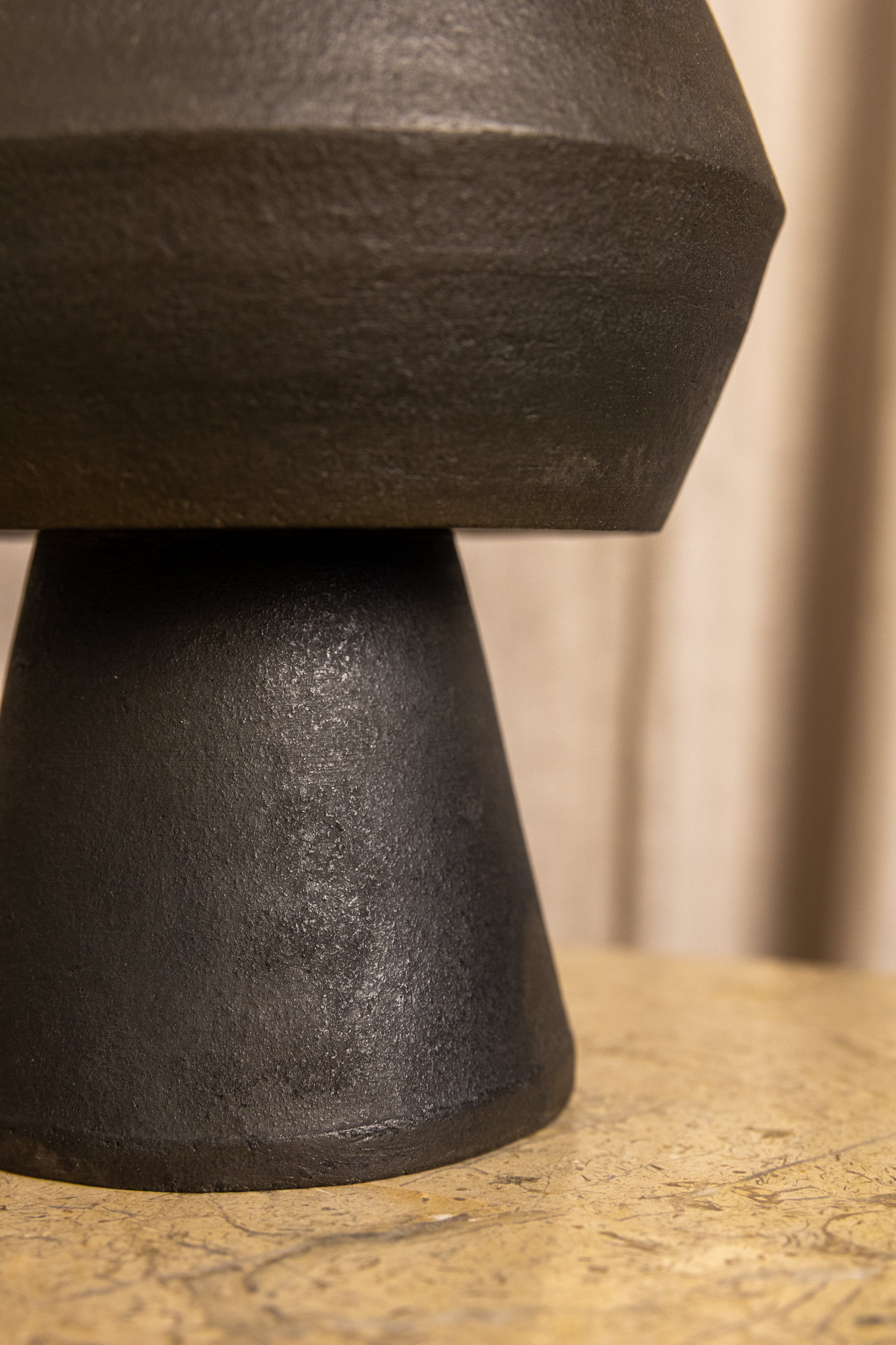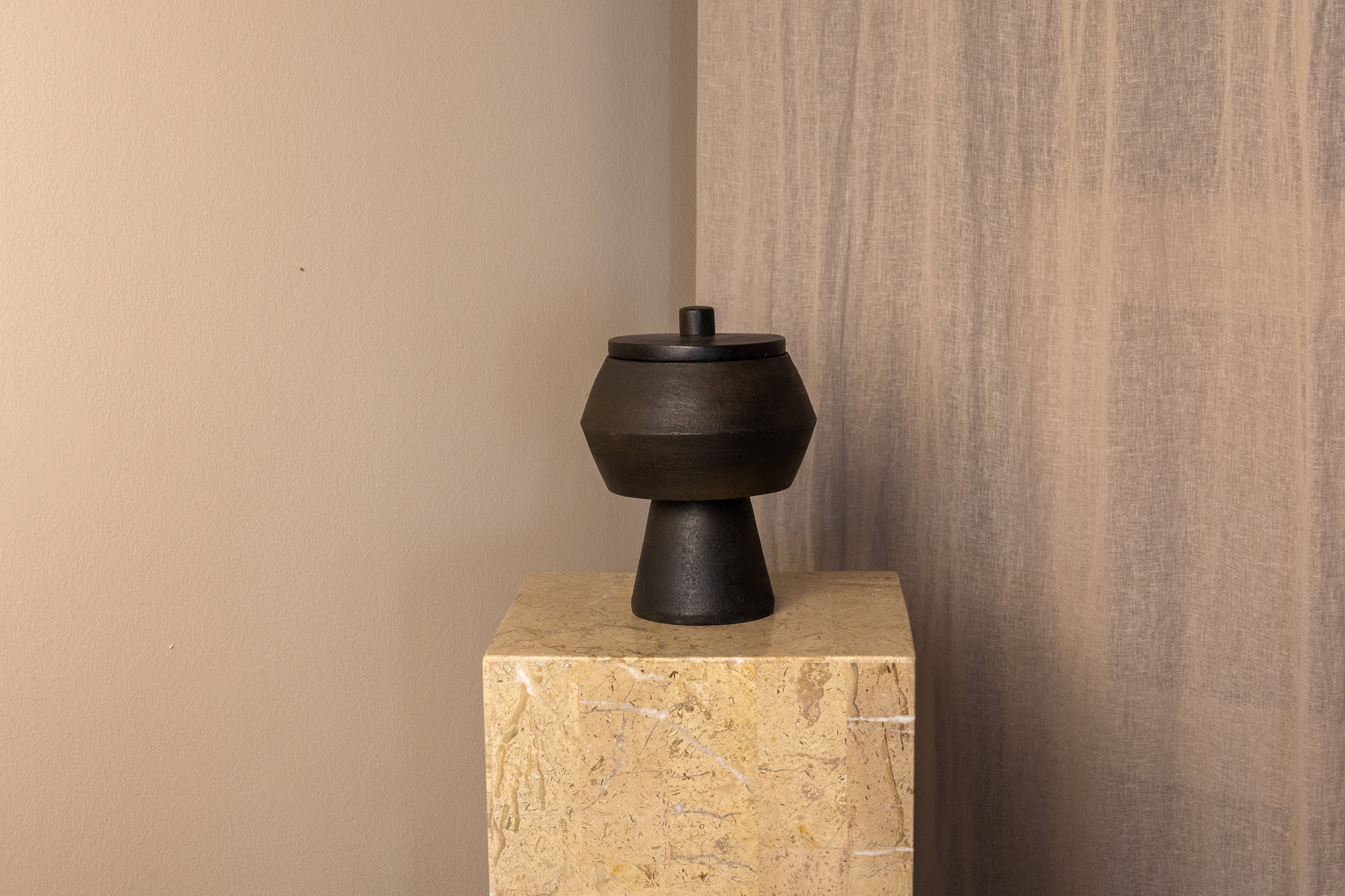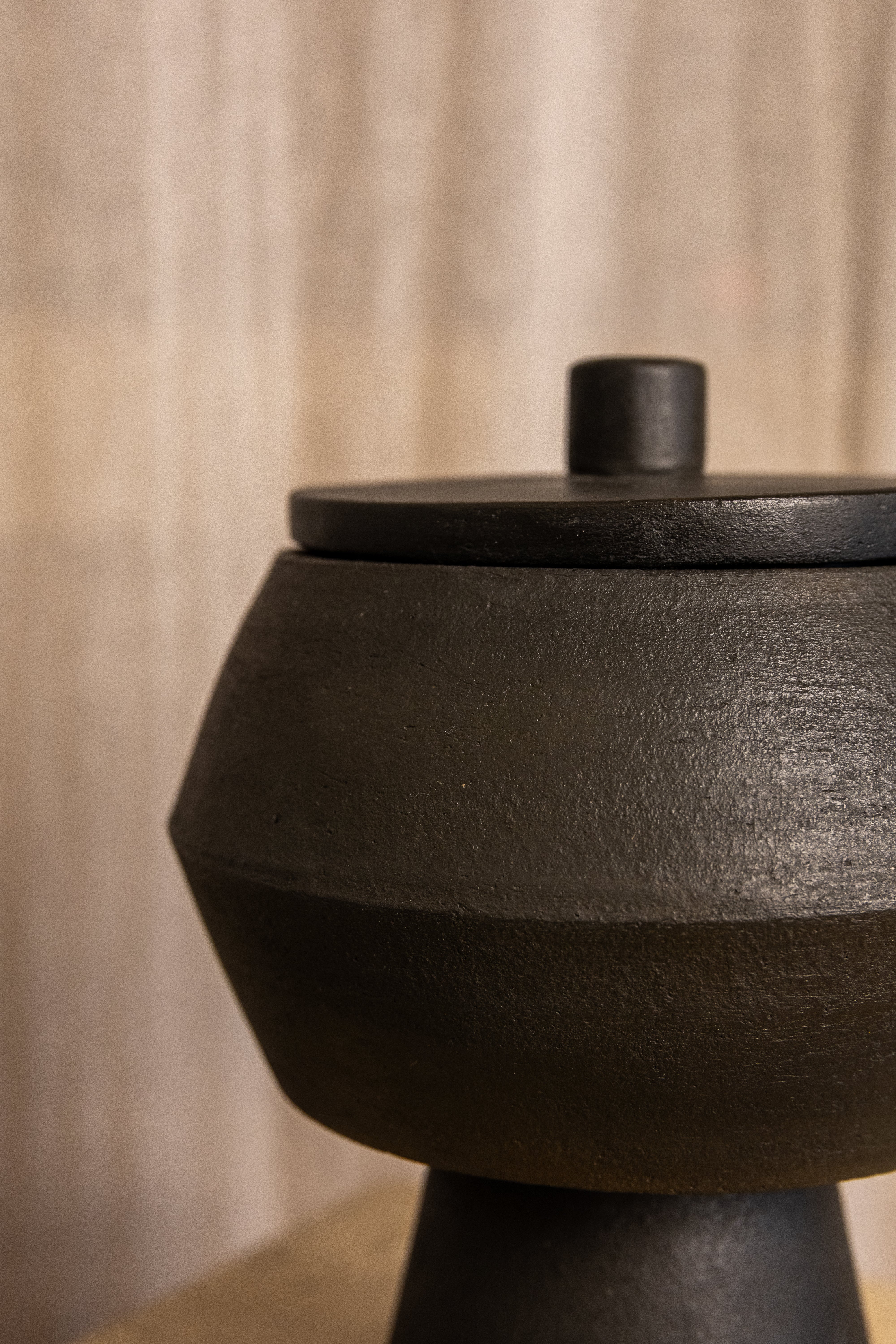 Clay No. 4 has a grounded, ceremonial feel - a hand-built clay form paired with a flat lid and rounded knob. The soft terracotta and smoke tones meet in a natural gradient, with tactile textures that catch light gently. Ideal for open shelving or styled as a small anchor piece in a vignette.